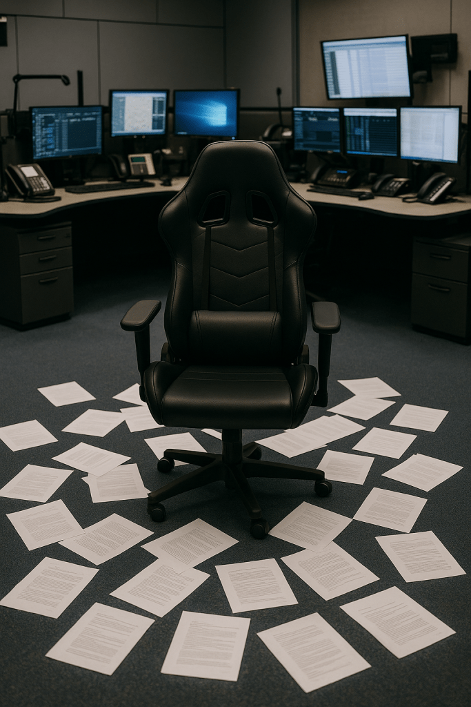 PROBLEM NUMBER ONE, SOLVED. THE SECOND? FIGURING OUT HOW THESE PAPERS DECIDED TO BECOME AUDIENCE MEMBERS AT MY SLOW-MOTION MELTDOWN. I START ASKING AROUND THE ROOM: WHO PLACED THE LONG-AWAITED, GRACE-TESTED DOCUMENTS HERE? WHO LET ME AND MY OFFICER SUFFER THROUGH AN HOUR OF RADIO SIGHS AND SECONDHAND DISAPPOINTMENT? THE ANSWER? NO ONE. APPARENTLY, THE PAPERS JUST MATERIALIZED ON THAT CHAIR ALL BY THEMSELVES – LIKE PARANORMAL EVIDENCE THAT THE FAX MACHINE HAS A SENSE OF HUMOR.