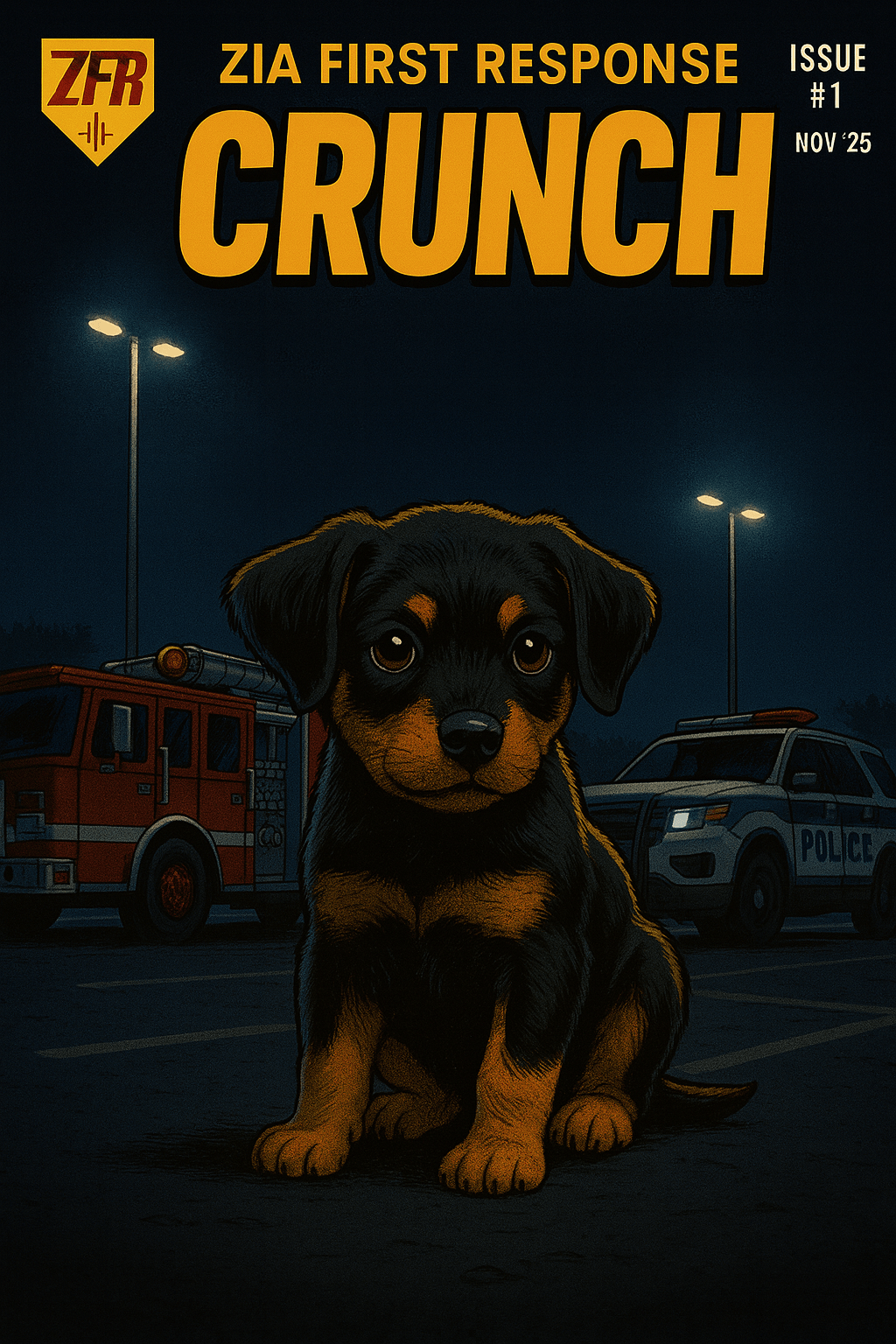 TWO DAYS AFTER THANKSGIVING, CRUNCH APPEARED IN A WALMART PARKING LOT, SMALL ENOUGH TO BE MISSED BUT BRAVE ENOUGH TO BE SEEN. AFTER VETERINARY EVALUATION, HIS AGE WAS DETERMINED TO BE APPROXIMATELY FIVE TO SIX WEEKS OLD AT THE TIME HE FOUND US. ALONE, UNHOUSED, AND FAR TOO YOUNG TO BE NAVIGATING THE WORLD ON HIS OWN, CRUNCH DID WHAT FIRST RESPONDERS RECOGNIZE INSTINCTIVELY. HE FOUND HELP.