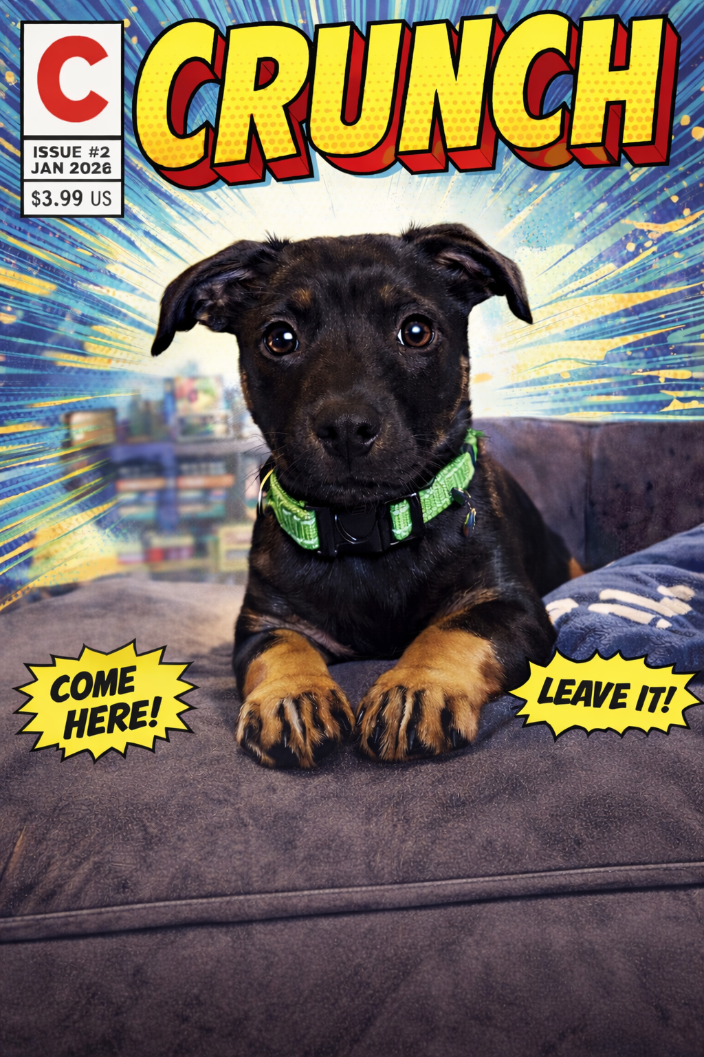WATCHING FROM THE SIDELINES ARE HIS OLDER ADOPTED BROTHER AND SISTER. VETERANS OF THE HOUSEHOLD. CALM. SEASONED. UNBOTHERED. THEY TEACH BY EXAMPLE. HOW TO WAIT. HOW TO LISTEN. HOW TO HOLD THE LINE WHEN TEMPTATION IS NEAR. CRUNCH STUDIES THEM LIKE LEGENDS, MIMICKING THEIR PATIENCE, CHASING THEIR APPROVAL, AND SLOWLY FINDING HIS RHYTHM.